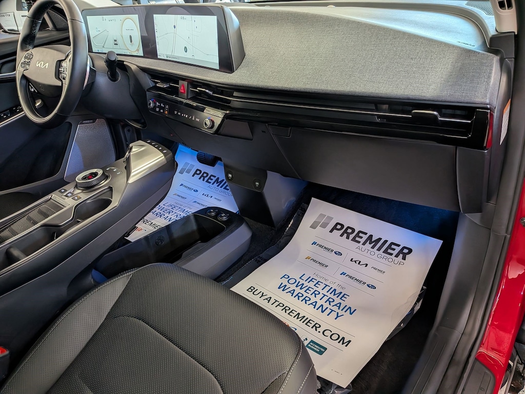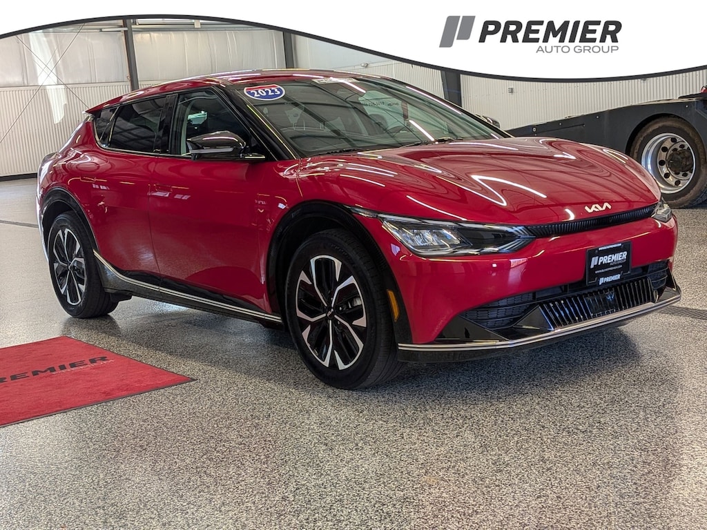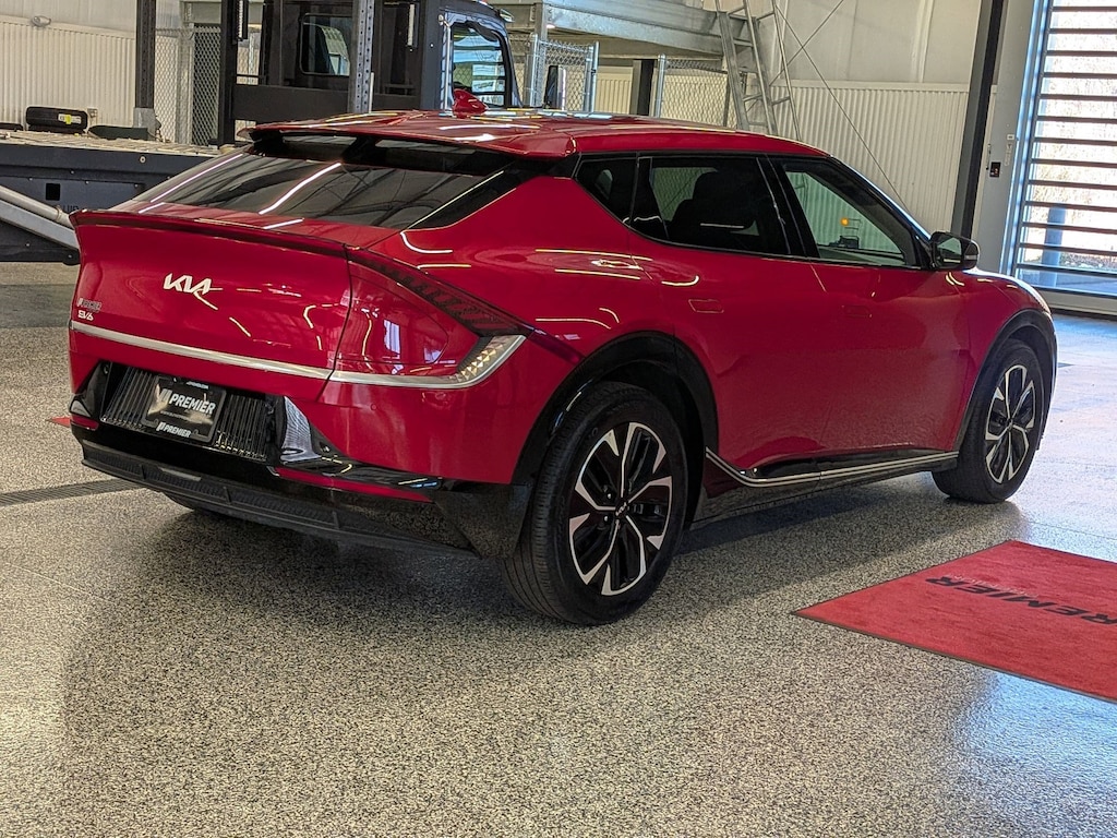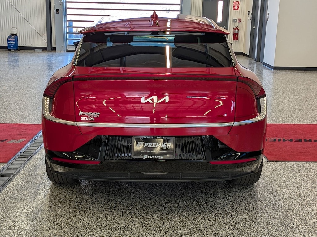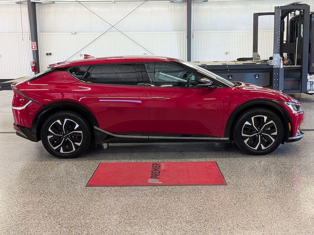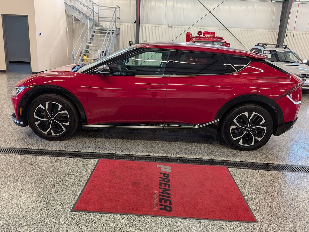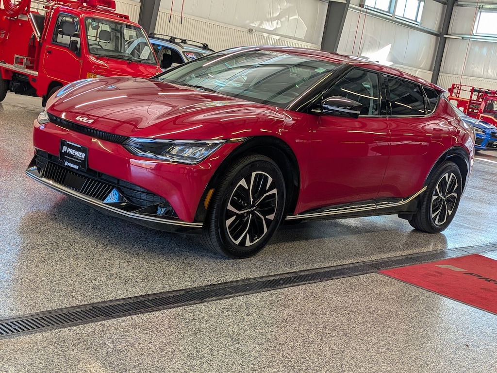 KIA CERTIFIED PREOWNED. 1 OWNER ACCIDENT FREE VEHICLE HISTORY, * NAVIGATION, EV6 Wind, Electric Motor, 1-Speed Automatic, Runway Red, Black w/Vegan Leather Seat Trim, 14 Speakers, 4-Wheel Disc Brakes, Air Conditioning, Apple CarPlay & Android Auto, Auto High-beam Headlights, Auto-dimming Rear-View mirror, Automatic temperature control, Axle Ratio: 10.650, Brake assist, Bumpers: body-color, Driver door bin, Dual front impact airbags, EC Mirror w/HomeLink, Electronic Stability Control, Emergency communication system, Four wheel independent suspension, Front Bucket Seats, Fully automatic headlights, Heated & Ventilated Front Bucket Seats, Heated rear seats, Heated steering wheel, Illuminated entry, Knee airbag, Memory seat, Navigation system: AVN 5.0 Navigation System, Occupant sensing airbag, Outside temperature display, Panic alarm, Passenger door bin, Power door mirrors, Power Liftgate, Power windows, Radio: Meridian Premium Audio System, Rain sensing wipers, Rear anti-roll bar, Rear seat center armrest, Rear window defroster, Split folding rear seat, Steering wheel mounted audio controls, Telescoping steering wheel, Traction control, Trip computer, Turn signal indicator mirrors, Variably intermittent wipers, Ventilated front seats, Wheels: 7.5J x 19" Black Painted Alloy. Certified.